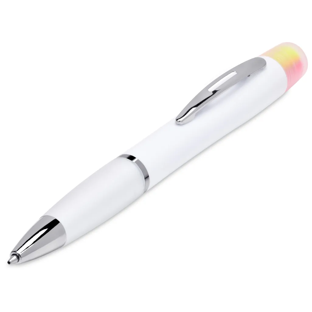 A stationery lover’s delight, featuring a black ink ball pen, with a highlighter on the back end. The highlighter is split into 3, giving you a choice of yellow, orange and pink highlighting. 14.7 ( l ) cm ABS & PP ball pen with black German ink 3-in-1 highlighter nib: yellow, orange and pink bulk packed